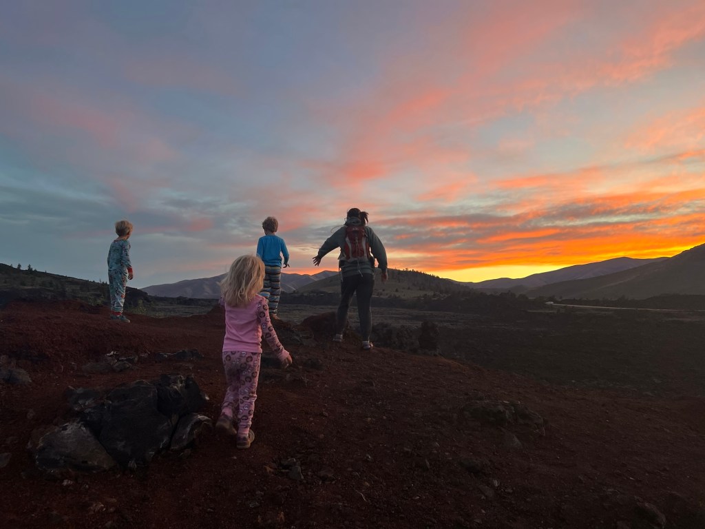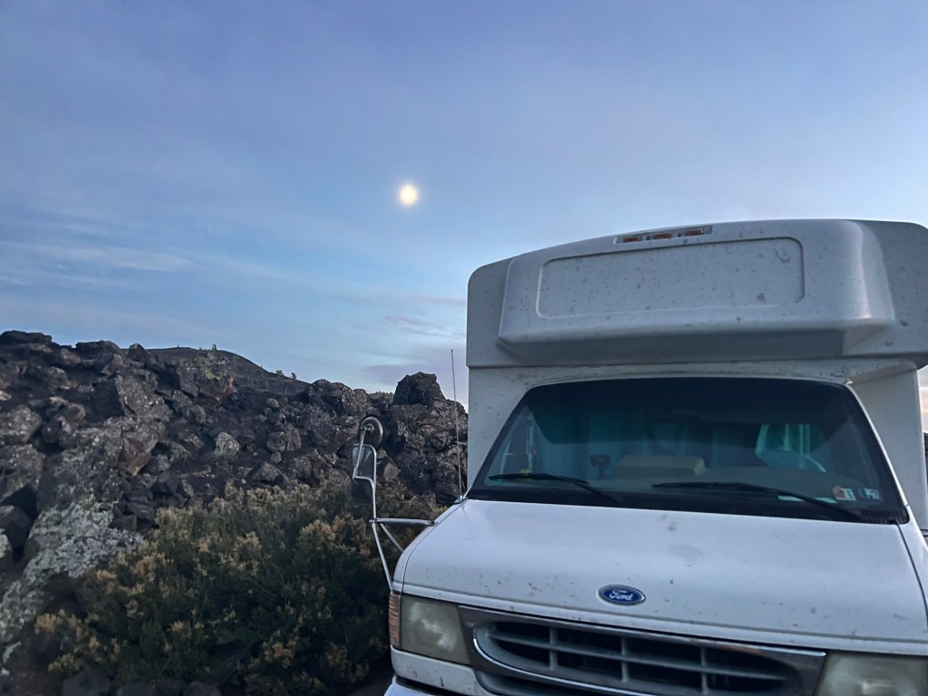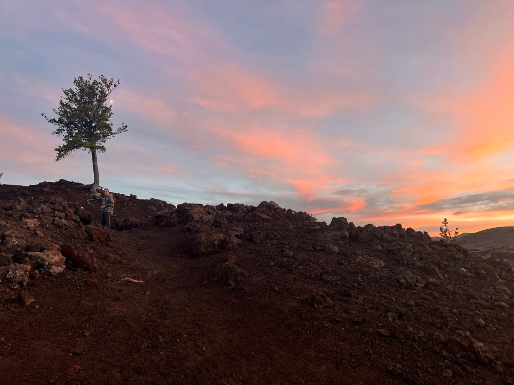 These pictures are from our evening at Craters of The Moon. We went to a ranger talk about the history of exploration in the area then hiked to the top of a pile of lava rock that was home to a lone limber pine, where we watched the sun set. The spot where seemingly no one else cares to visit yet Amy never wants to leave. We will be back many times I am sure, and some day we will be telling tales of how we used to just ride in a get a campsite without a reservation and every parking lot had plenty of room.