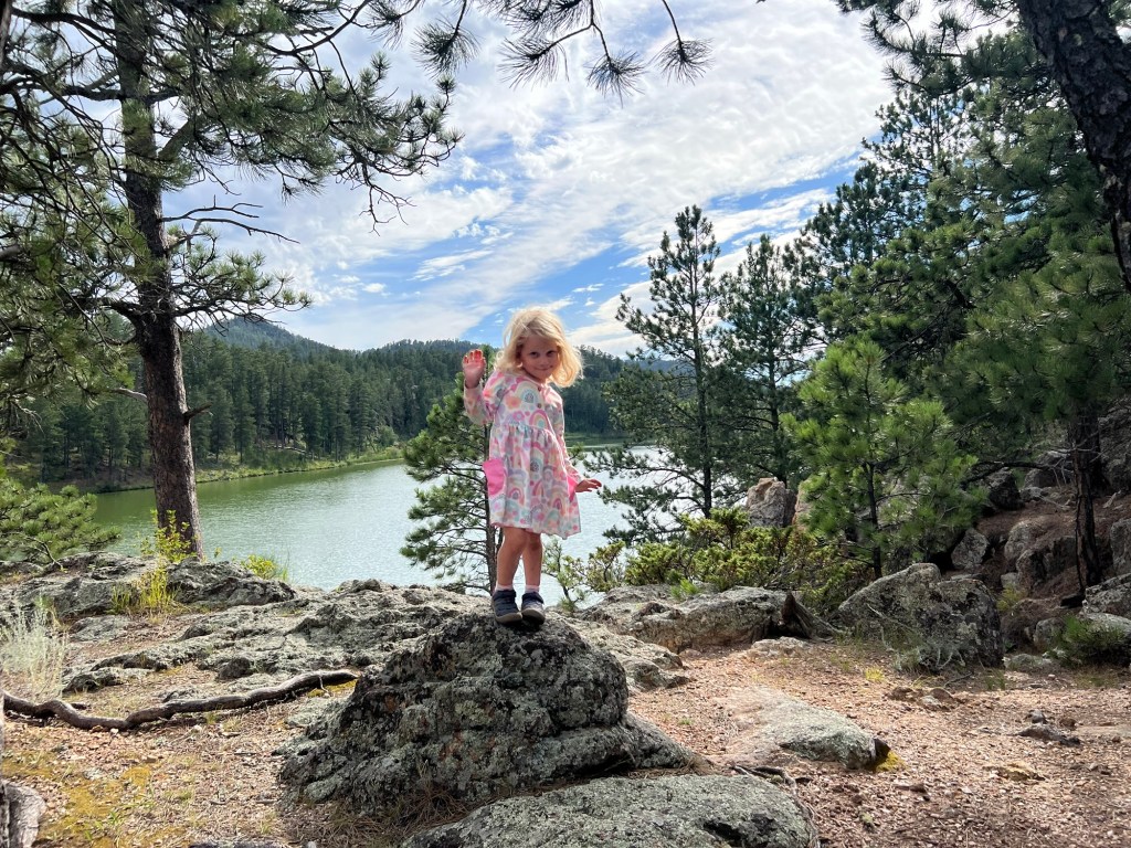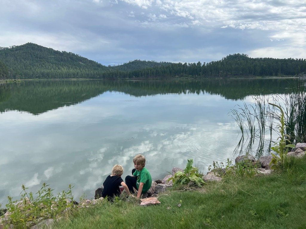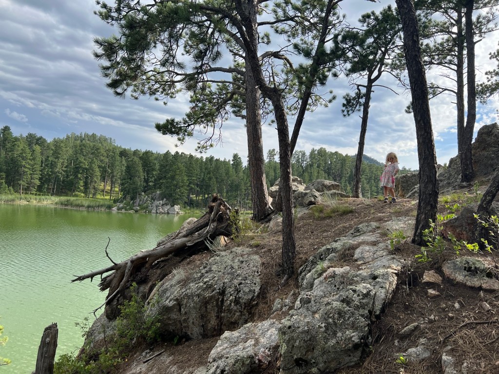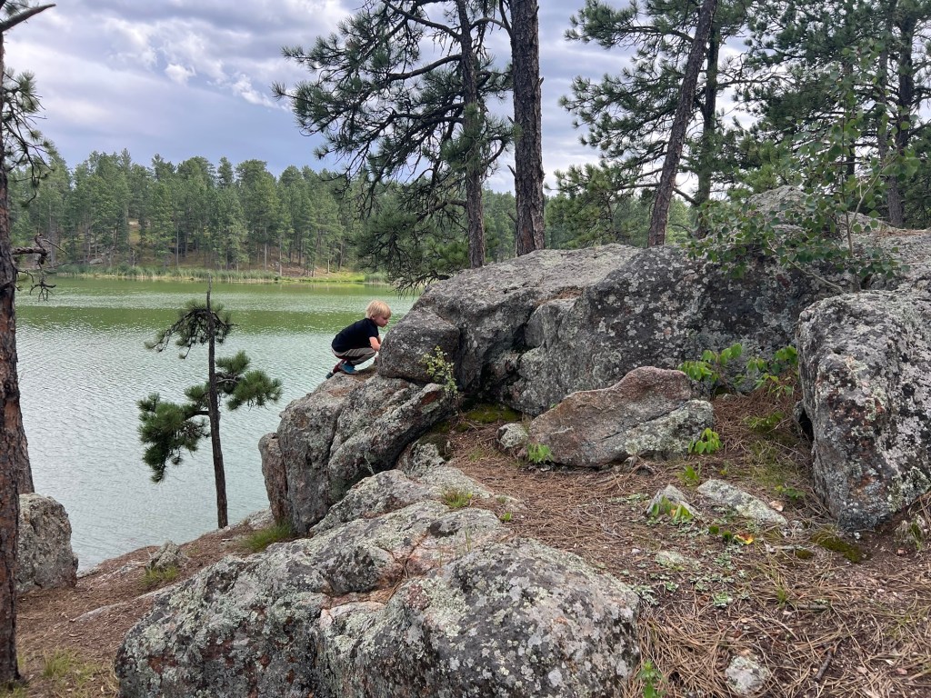 Our stay in Custer will be cut in half by the decision we made to recover at a motel in Lander, Wyoming. We swing by the town of Custer on the way in for some pie at a local staple. We soon realize that we have arrived during the height of the Sturgis bike rally and we will find ourselves surrounded by motorcycle campers for the next few days. We made camp along Stockade lake at a beautiful large forested site overlooking a field complete with a playground, might as well be free babysitting. We decided to hike and explored the lakeshore near our camp, we didn’t get far fast because of the unlimited ripe fresh raspberries lining the trail. We spent the majority of our day lounging around, alternating between reading and writing and playing.